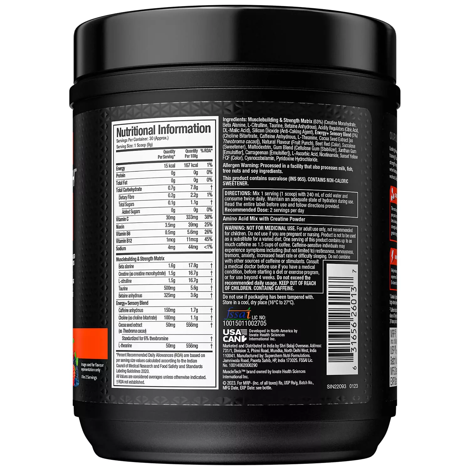 The formula includes creatine monohydrate to support muscle energy and strength, beta-alanine to help with endurance and fatigue resistance, betaine anhydrous for strength and power support, and Nitrosigine® to promote nitric oxide support for better pumps and muscle fullness. The product also includes taurine and caffeine anhydrous to help increase workout energy and mental focus.