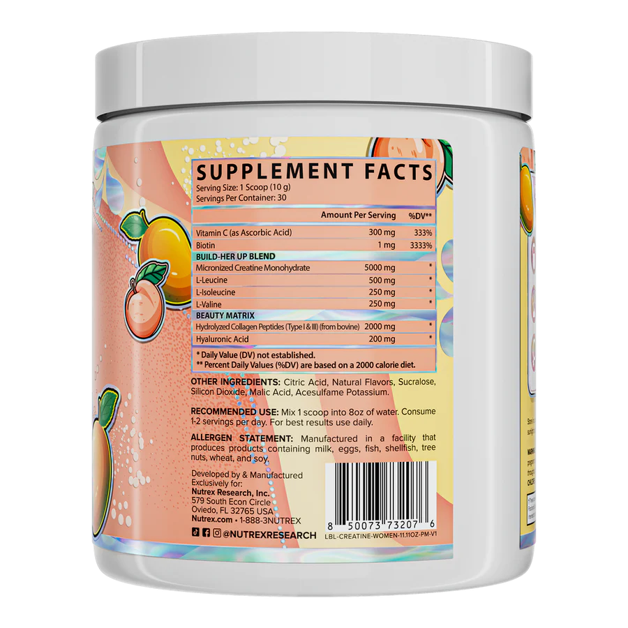 Nutrex Creatine For Women is a women-focused creatine product positioned by Nutrex to support body tone, beauty support, cognitive function, bone health, and hormonal balance. The official Nutrex site currently lists it in flavors including Pink Lemonade and Peach Mango.