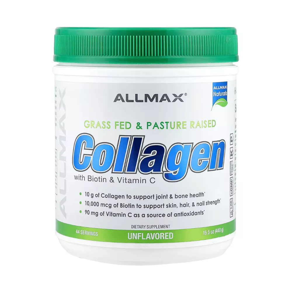 ALLMAX Collagen Peptides + Vitamins is a daily collagen powder sourced from grass-fed, pasture-raised bovinecollagen peptides (Types I, II & III), enhanced with Vitamin C + Biotin to support skin, hair, nails, joints, and bone health.