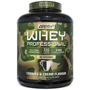 Army 1 Whey Professional Protein Powder 2000g (Cookies & Cream Flavour) is a high-quality whey protein supplement formulated to support active lifestyles and everyday nutritional needs. With approximately 66 servings per container, it offers a convenient and reliable way to help meet daily protein requirements as part of a balanced diet.